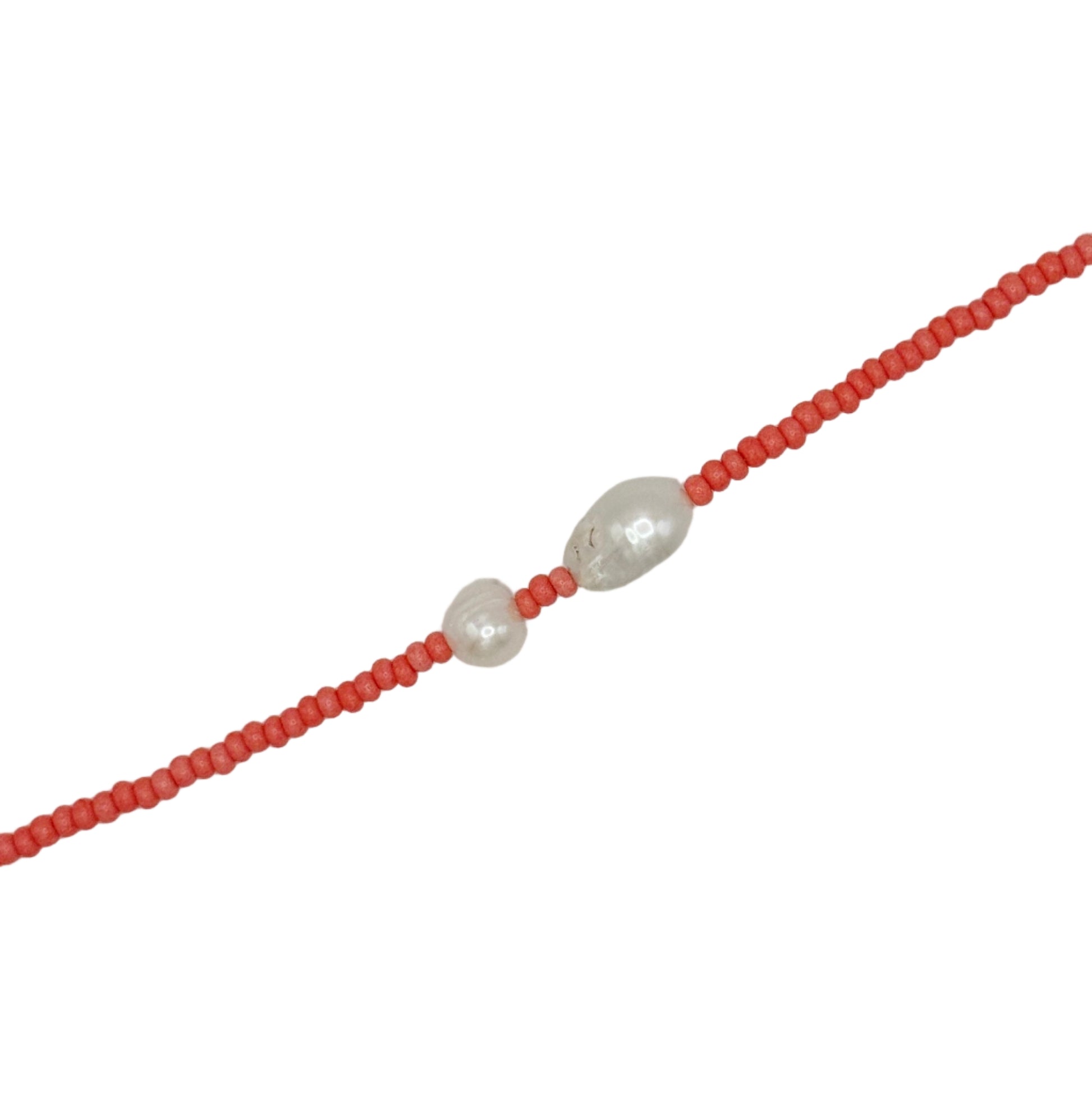 Two baroque pearls aligned along a strand of fine seed beads — each one slightly irregular, perfectly balanced in composition.