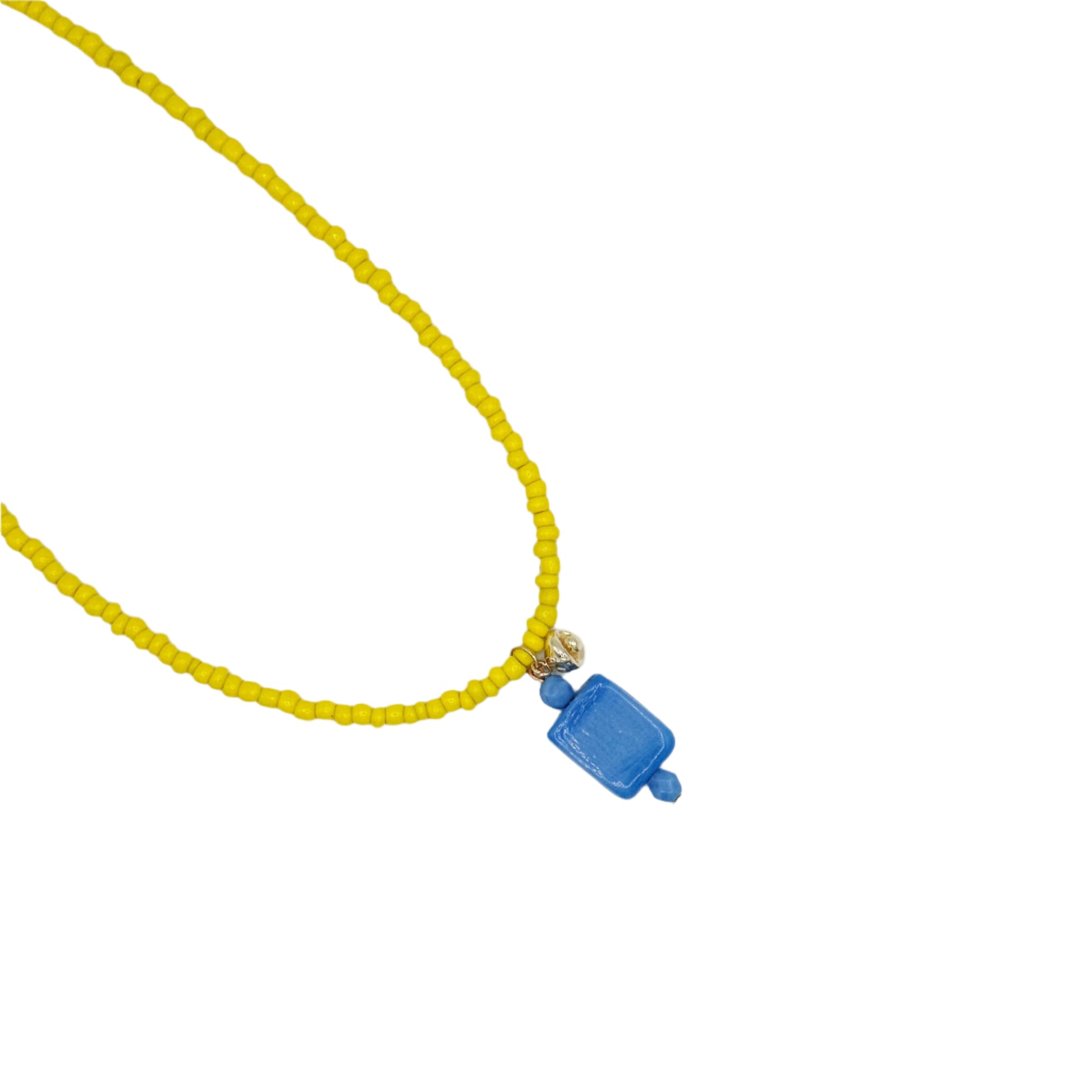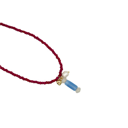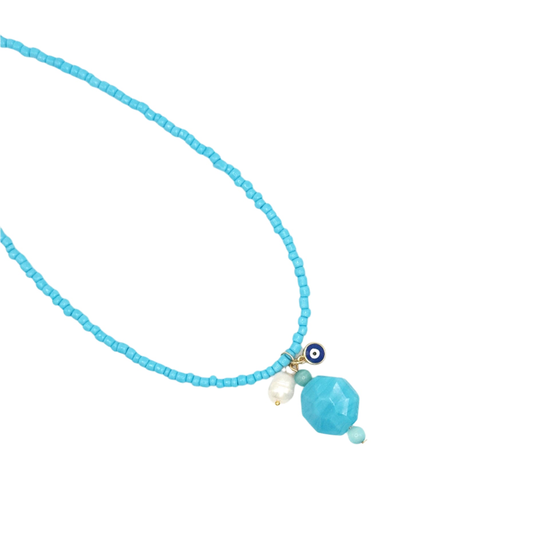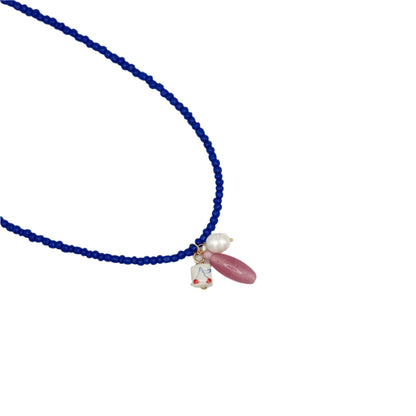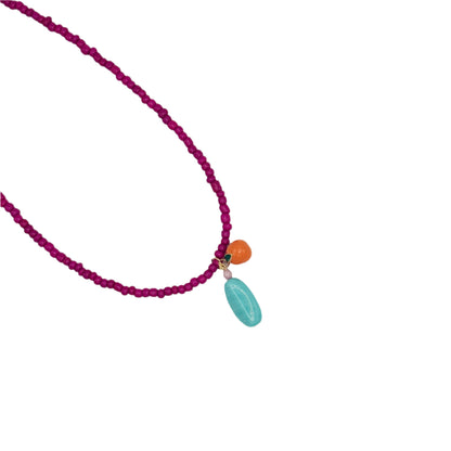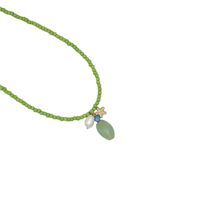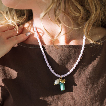 Seed bead necklace with charms and a 14k gold filled lobster clasp.